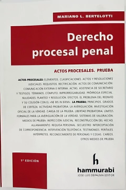 ACTOS PROCESALES: Elementos. Clasificaciones. Actos y resoluciones judiciales. Requisitos. Rectificación. Actos de comunicación: Comunicación externa e interna. Actas. Asistencia de secretario y testigos. Términos: Cómputo. Improrrogabilidad. Prórroga especial. Nulidades: Planteo y resolución. Efectos. El problema del reenvío y su colisión con el «ne bis in idem». LA PRUEBA: Principios. Grados de certeza. Actividad probatoria. La averiguación. Investigación oficial de la verdad. Carga de la prueba. Libertad probatoria. Límites formales para la averiguación de la verdad. Sistemas de valoración. Medios de prueba: Inspección judicial. Reconstrucción del hecho. Allanamiento. Requisa personal. Secuestro. Interceptación de correspondencia. Intervención telefónica. Testimonios. Peritajes. Intérpretes. Reconocimiento de personas y cosas. Careos. Otros medios de prueba