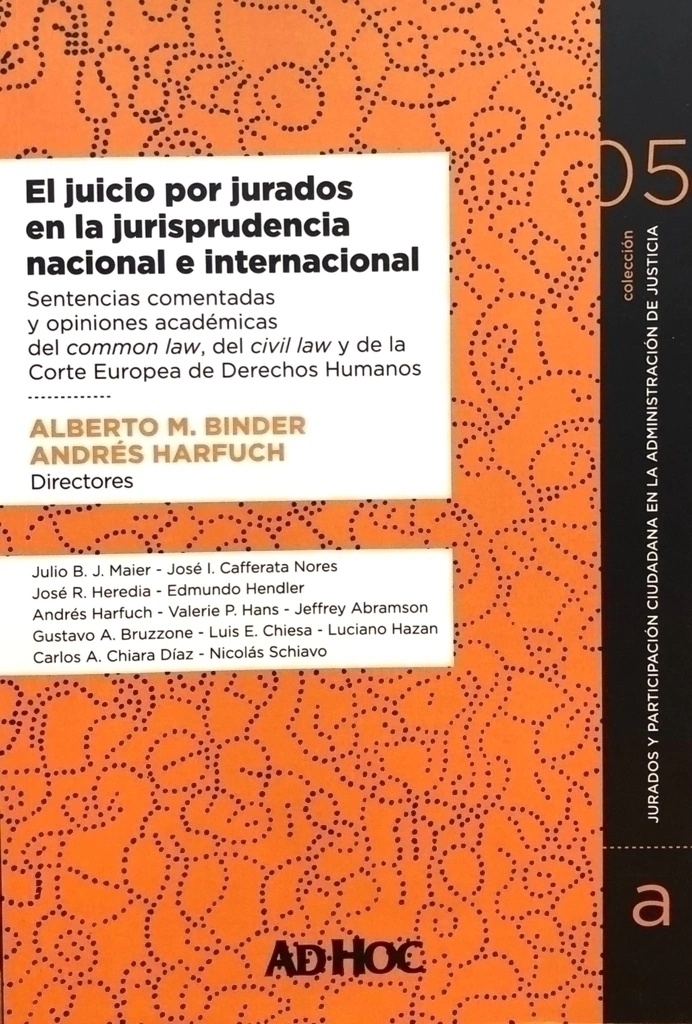 Constitucionalidad convencional del veredicto inmotivado y regla del secreto del jurado: «Taxquet vs. Belgium»; «Gregory vs. The United Kingdom» - Sobre enjuiciamiento por jurados, instrucciones a jueces y fundamentos de sentencias criminales, por J. B. J. Maier. El juicio por jurados como garantía del acusado y como derecho de la ciudadanía: «Duncan vs. Louisiana» - Comentario, por J. I. Cafferata Nores. El jurado de doce. El poder del número: «Patton vs. United States» - Nota al fallo «Patton vs. United States», por J. R. Heredia. Voir dire y selección del jurado. El litigio por la imparcialidad: «Skilling vs. United States» - El procedimiento de voir dire, por E. Hendler. El estándar constitucional de prueba más allá de duda razonable: In re «Winship» - Comentario, por A. Harfuch. El veredicto general del jurado. Prohibición del veredicto especial o con interrogatorios de hecho: «United States vs. Spock» - El veredicto general del jurado. «United States vs. Spock», 416 F. 2d 165 (1969), por V. P. Hans. El veredicto unánime: «Johnson vs. Louisiana» - Comentario, por J. Abramson. El jury nullification. El poder de nulificación del jurado: «United States of America, appellee, vs. Mary Moylan, Philip Berrigan, Thomas Lewis, George J. Mische, Thomas Melville, Marjorie Melville, John Hogan, James Darst, Daniel Berrigan, appellants» - El juicio por jurados y la posibilidad de controlar la ley anulándola: el jury nullification, por G. A. Bruzzone. La firmeza del veredicto absolutorio del jurado. Inimpugnabilidad del acusador. Double jeopardy y ne bis in idem: «Green vs. United States» - Breves apuntes sobre lo resuelto en el fallo «Green», por L. E. Chiesa. La regla de secreto del jurado: «Tanner vs. United States» - La presunta inconducta de los jurados, ¿es un problema de la regla del secreto o de la audiencia de voir dire?, por L. Hazan. Control e impugnación amplia de los veredictos condenatorios del jurado: «Hatchett vs. Commonwealth» - La prueba suficiente para la condena siempre debe ser una garantía para el imputado, por C. A. Chiara Díaz. «Javier Cavazos, Acting Warden vs. Shirley Ree Smith» - La admisibilidad de recurrir el veredicto del jurado clásico. A propósito del fallo «Cavazos», por N. Schiavo.