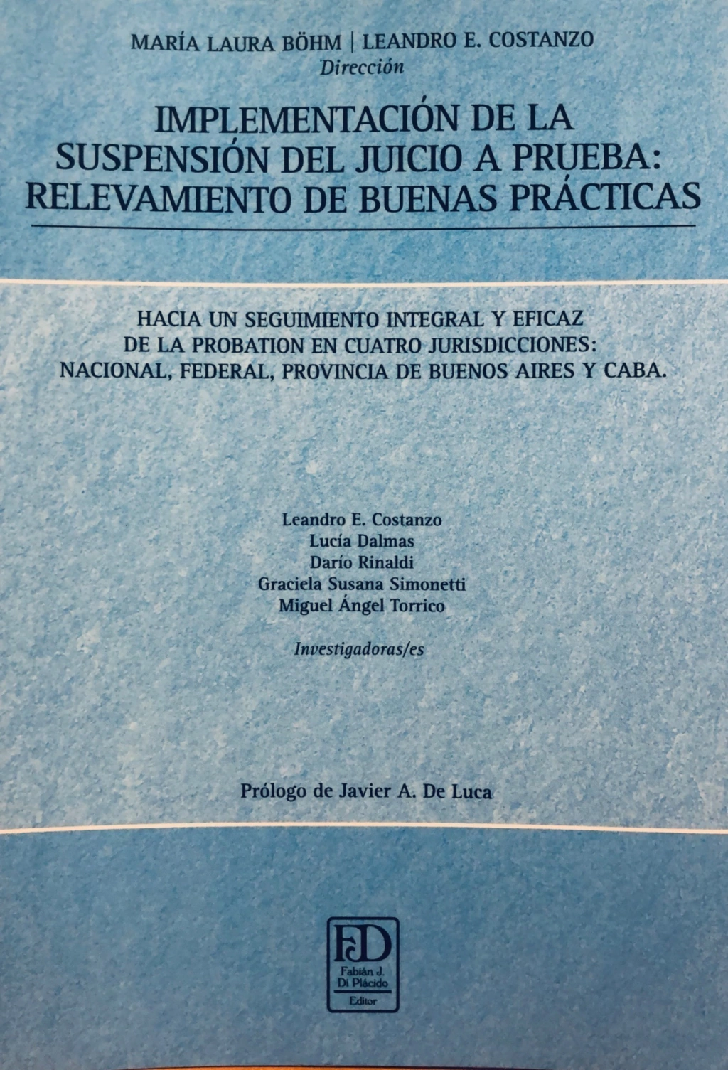 Prólogo. DESCRIPCIÓN DEL PROYECTO. Introducción. Conclusiones del proyecto anterior, diagnóstico previo a esta investigación y objetivos. Introducción básica conceptual y descripción del proyecto 26. La probation argentina. Estado actual del conocimiento. Datos. Buenas prácticas. Acercamiento teórico conceptual. Método y estructura de la investigación. PRIMERA ETAPA: TRABAJO EXPLORATORIO EN ORGANISMOS INTERVINIENTES. DESCRIPCIÓN DE SU INTERVENCIÓN Y PRIMEROS ACERCAMIENTOS A LAS BUENAS PRÁCTICAS. Introducción a la tarea de “exploración”. Entrevistas y acercamientos exploratorios. Ámbito de la Justicia Nacional. Reunión con la Unidad Fiscal de Medidas Alternativas al Proceso Penal con Intervención en el Control y Seguimiento de las suspensiones del proceso a prueba, Abog. Sheila De Elia Otero. Introducción. Entrevista. Reunión con personal de la Unidad de Letrados Móviles para la Asistencia de las Personas no Privadas de Libertad de la Defensoría General de la Nación. Introducción. Entrevista. Ámbito de la Justicia Nacional y Federal. Intercambio con la Directora de la Dirección de Control y Asistencia de Ejecución Penal (DCAEP). Abog. María Virginia Barreyro. Introducción. Entrevista. Ámbito de la Justicia Nacional y Federal (con presencia en otras jurisdicciones). Reunión con el titular de la Dirección General de Acceso a la Justicia del Ministerio Público Fiscal de la Nación (ATAJO), Abog. Julián Axat. Introducción. Entrevista. Ámbito de la provincia de Buenos Aires. Reunión con la Trabajadora Social del Patronato de Liberados Bonaerense, Licenciada Graciela Simonetti. Introducción. Entrevista. Juzgado de primera instancia de Garantías N° 1 de Lomas de Zamora, Departamento Judicial de Lomas de Zamora (Juez Jorge Walter López): Protocolo de trabajo y seguimiento de la suspensión del proceso a prueba. Introducción. Evaluación exploratoria. Ámbito de la CABA. Reunión con el titular de la Oficina de Control de Suspensión del Proceso a Prueba del MPF, Abog. Santiago Cafferata. Introducción. Entrevista. Reunión con una operadora del Patronato de Liberados de la CABA. Introducción. Entrevista. Conclusión preliminar. SEGUNDA ETAPA. RELEVAMIENTO DE BUENAS PRÁCTICAS. Introducción. Entrevistas. Justicia Nacional. Entrevista con la titular del Juzgado Nacional de Ejecución Penal N° 5 Jueza Abog. Jimena Monsalve. Introducción. Entrevista. Justicia de la Provincia de Buenos Aires. Entrevista con profesionales que desarrollan su labor en la Oficina de Coordinación Institucional con el Patronato de Liberados Bonaerense del Ministerio Público (Nuevas oficinas de control de Suspensión del Proceso a Prueba). Introducción. Entrevista a profesional C. Entrevista a profesional L. Justicia de CABA. Entrevista con titular de la Oficina de Control de Suspensión del Proceso a Prueba del Ministerio Público Fiscal de la CABA, Lic. Fabricio Pizzarello. Introducción. Entrevista. Entrevista con una trabajadora del Patronato de Liberados de la CABA. Introducción. Entrevista. Jurisdicción Federal (en CABA). Entrevista al juez Ricardo Ángel Basílico, presidente del Tribunal Oral en lo Criminal Federal Nº 1 de Capital Federal. Introducción. Entrevista. TERCERA ETAPA: SISTEMATIZACIÓN DE DIFICULTADES, BUENAS PRÁCTICAS Y PROPUESTAS. Introducción. Justicia Nacional. Jurisdicción de la Provincia de Buenos Aires. Jurisdicción de CABA. Jurisdicción Federal. CONCLUSIONES. Bibliografía. ANEXOS 1. Cuestionario utilizado como guía para la entrevista de operadoras y operadores. Anexo 2. Protocolo de trabajo del Juzgado de Garantías N° 1 del Departamento Judicial Lomas de Zamora. Anexo 3. Reporte de validación como buena práctica. Anexo 4. Protocolo de trabajo MPF CABA. Resolución FG 078-08. Anexo 4 b. Anexos. Resolución FG 078-08. Anexo 5. Propuesta de creación de un centro de almacenamiento de telefonía celular para el seguimiento.