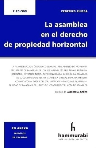 La asamblea como órgano consorcial. Reglamento de propiedad. Facultades de la asamblea. Clases: asambleas preliminar, primaria, ordinaria, extraordinaria, autoconvocada, judicial. La asamblea en el consorcio de hecho. Asamblea virtual. Funcionamiento: convocatoria, orden del día, votación -mayoría, quórum-. Nulidad de la asamblea. Libros del consorcio y el acta de asamblea