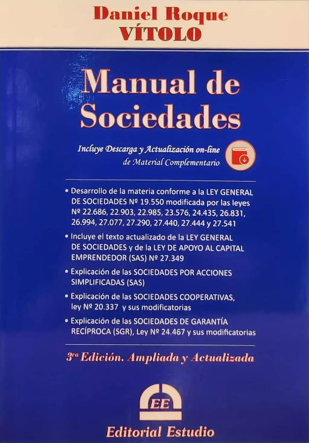 Desarrollo de la materia conforme a la LEY GENERAL DE SOCIEDADES Nº 19.550 modificada por las leyes Nº 22.686, 22.903, 22.985, 23.576, 24.435, 26.831, 26.994, 27.077, 27.290, 27.440, 27.444 y 27.541 Obra estructurada y concebida por el Profesor Vítolo con el objeto de brindar un texto apropiado para el desarrollo de los cursos regulares de Derecho Societario en las facultades públicas y privadas de todo el país para los profesores y estudiantes de Derecho, Ciencias Económicas y Administración; así como de apoyo para los jóvenes profesionales y graduados. • Incluye el texto actualizado de la LEY GENERAL DE SOCIEDADES y de la Ley de Apoyo al Capital Emprendedor (SAS) Nº 27.349 • Explicación de las Sociedades por Acciones Simplificadas (SAS) • Explicación de las Sociedades COOPERATIVAS, ley Nº 20.337 y sus modificatorias • Explicación de las Sociedades DE GARANTÍA RECÍPROCA (SGR), Ley Nº 24.467 y sus modificatorias